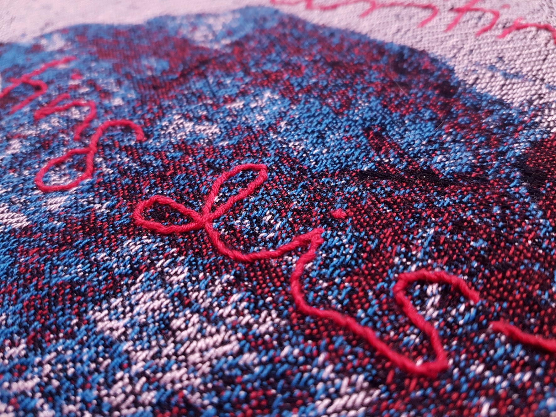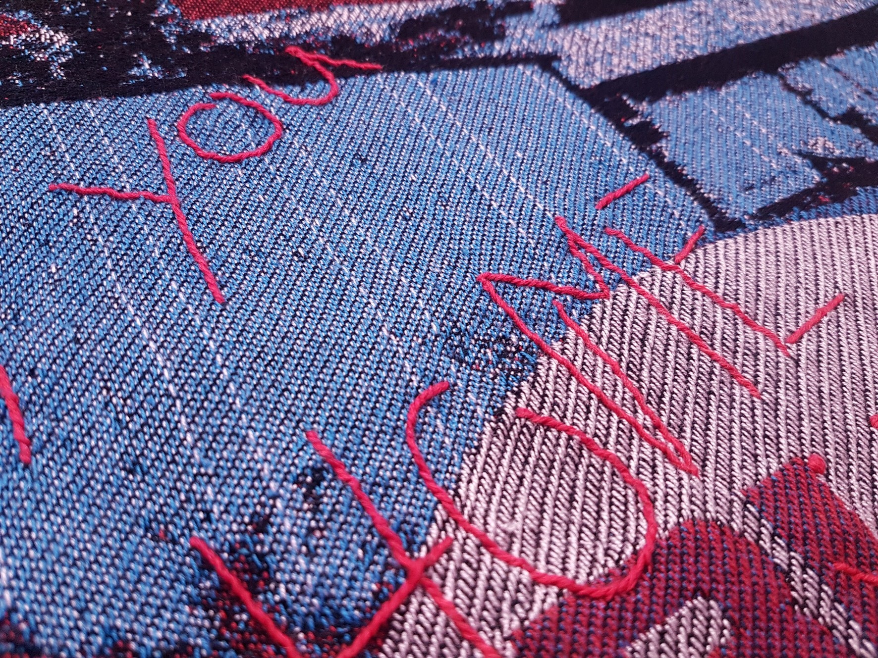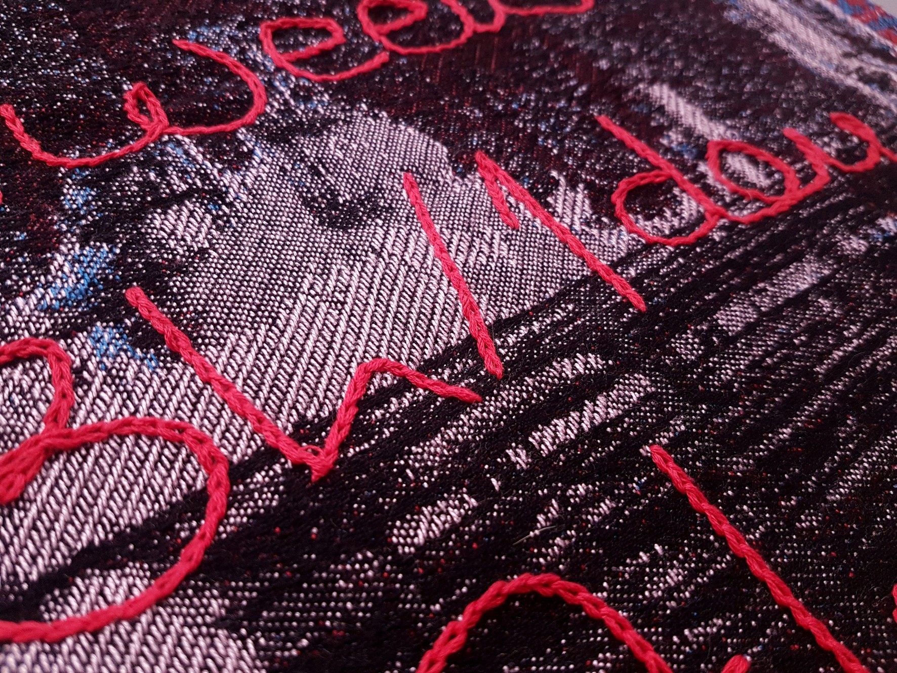 For the past three years, I have been exploring the presence of text in textile works, mainly through manual weavings made on a low-warp loom. In the work presented below, I propose a different technical approach. Although some of my tapestries had incorporated hand-embroidered texts, for the first time I make use of images and a non-manual digital technique such as jacquard weaving.