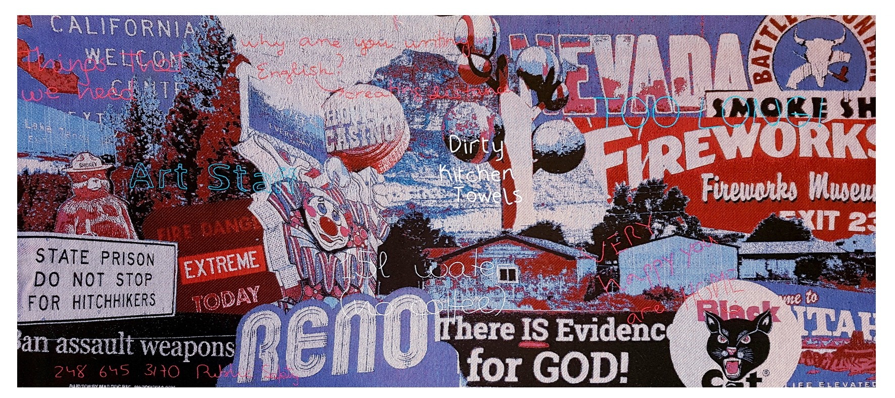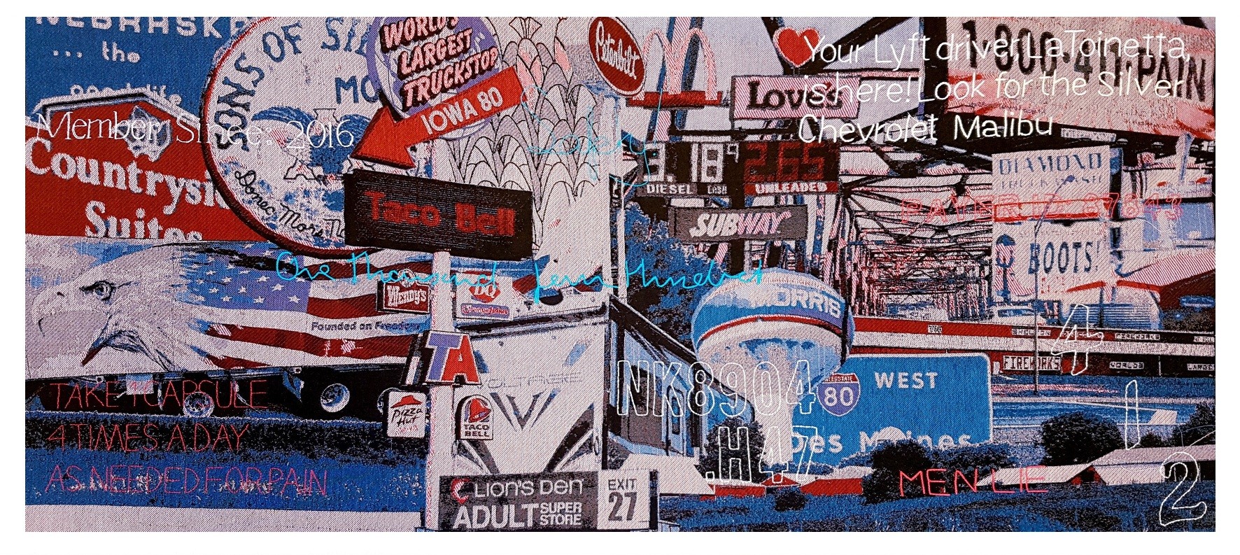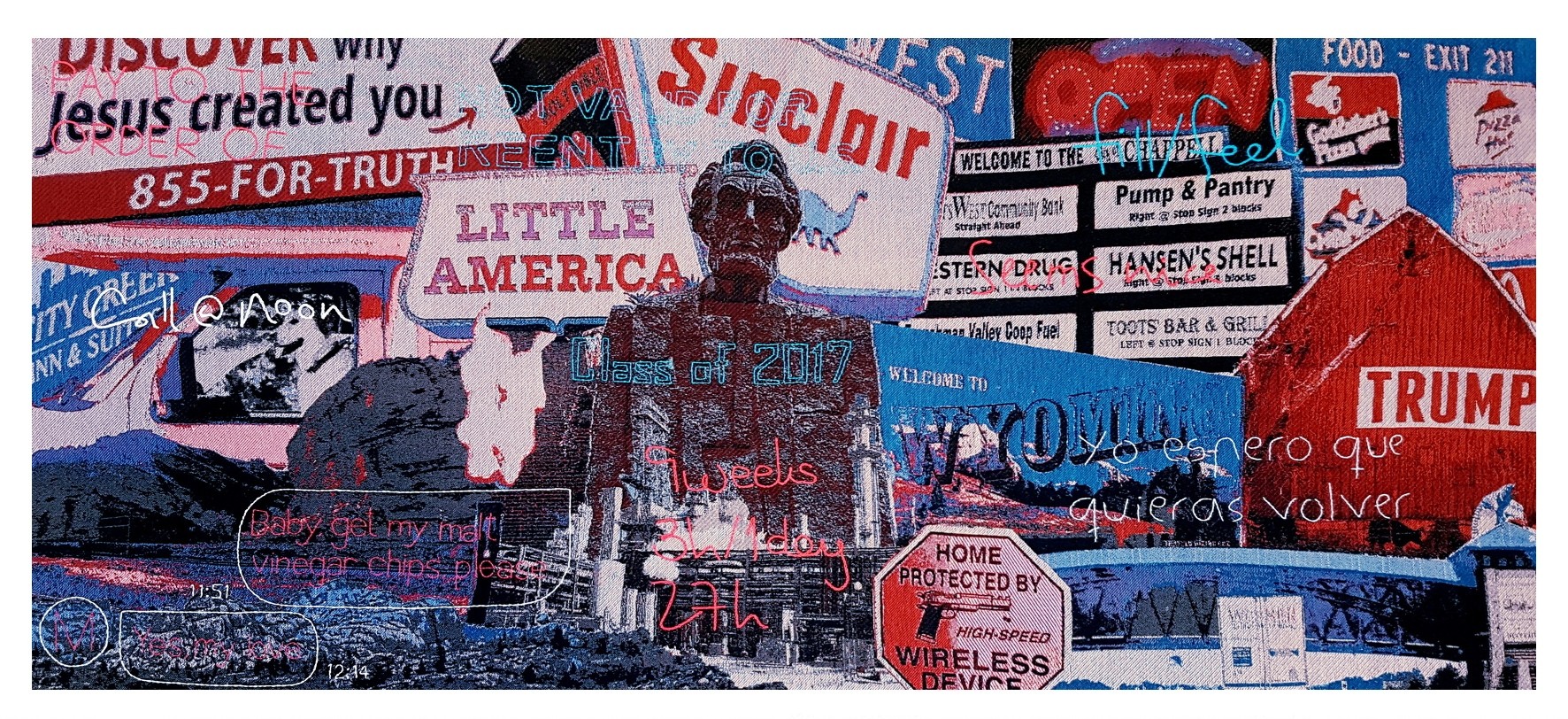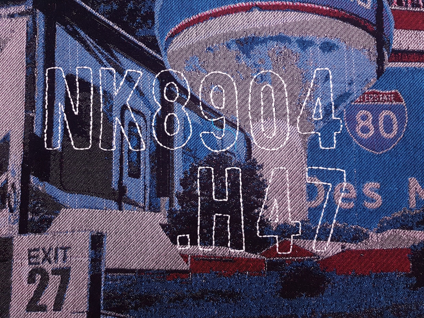 'Mapa Tejido de la Interestatal 80' began to take shape in August 2018, based on a road trip from Michigan, the American state where I had been living for the past three years, to California. An intense three-day trip through Interstate 80 - or I80 - with its cornfields, farms, oil refineries, salt deserts, fire-ravaged mountains, truck stops, seedy motels, big cities, and impoverished suburbs. Michigan, Indiana, Illinois, Iowa, Nebraska, Wyoming, Utah, Nevada, and California. During this trip, which lasted approximately 36 non-consecutive hours, I was able to take a series of photos and videos that show the contrasts - landscape, economic, and cultural - of a country as vast as the United States. With the images, I created three collages, one for each of the three days of the trip, which were woven on a digital loom in California during the month of October. The chosen color palette - red, blue, white, and black - not only visually harmonizes the images but also refers to the flag of the country and all the paraphernalia, festive and propagandistic, that decorates shops, homes, and streets as a celebration of American nationalism. This amalgam of images serves as a background, a visual context, almost like a theatrical decoration, to narrate, through embroidered text - of a more personal and intrinsic nature to my particular experience - a time that marked my artistic, personal, and professional life.